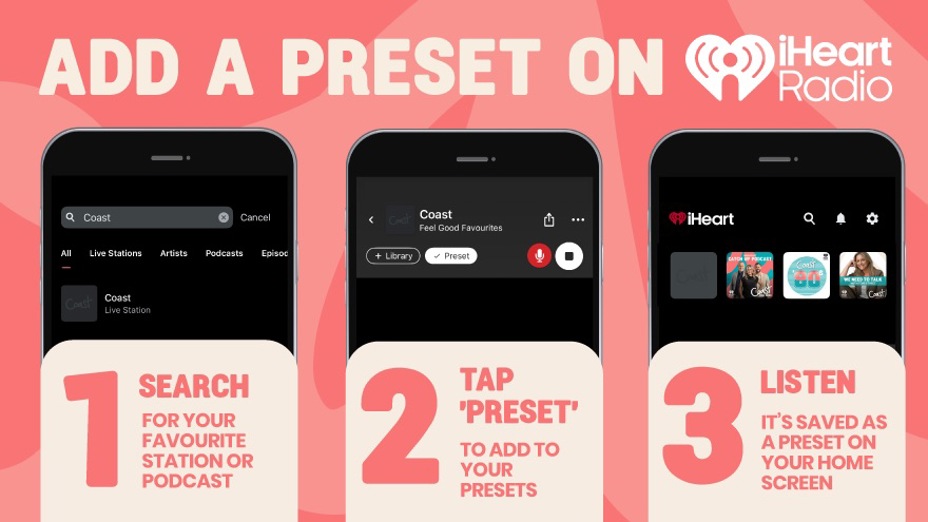 Saving Coast and your favourite podcasts and playlists as a preset is just a tap away! Now your favourite stations and podcasts will always be the first thing you see when you open the iHeart app or connect to Apple CarPlay or Android Auto.