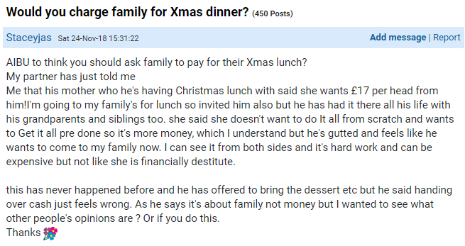 User Staceyjas asked if she was being unreasonable to think you should ask the family to pay for their Christmas lunch – explaining how her partner’s mother is planning to charge £17 (NZ$32) per head for the holiday meal.