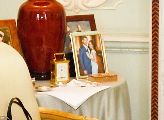 The photograph sits pride of place at the front of the table and sees Harry dressed in a blue suit facing Meghan who is wearing in a figure-hugging dress.